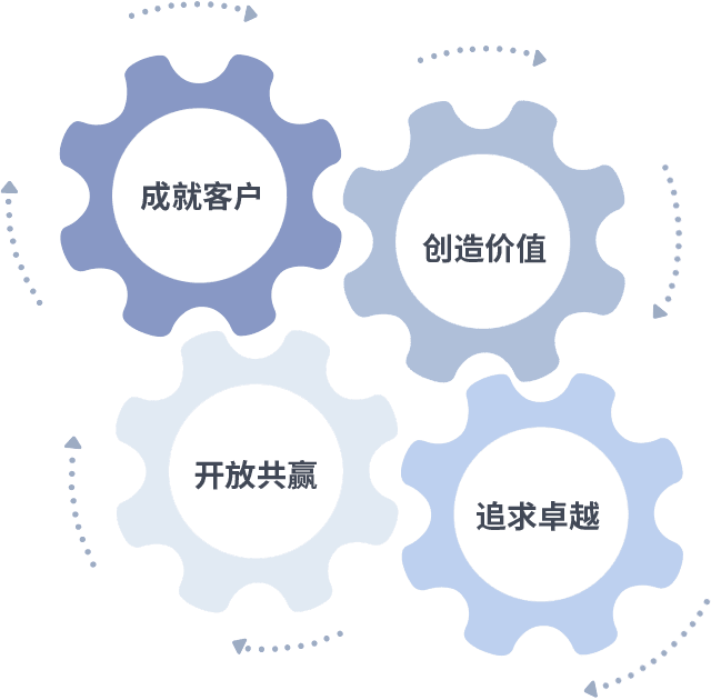 成就客户是一切决策的出发点,,,,创造价值是衡量所有工作的标准,,追求卓越是我们做事做人的态度,,,开放共赢是我们的格局也是最终的结果。。。。价值观的齿轮环环相扣,,,推动着组织里的每个人不断向前。。。。